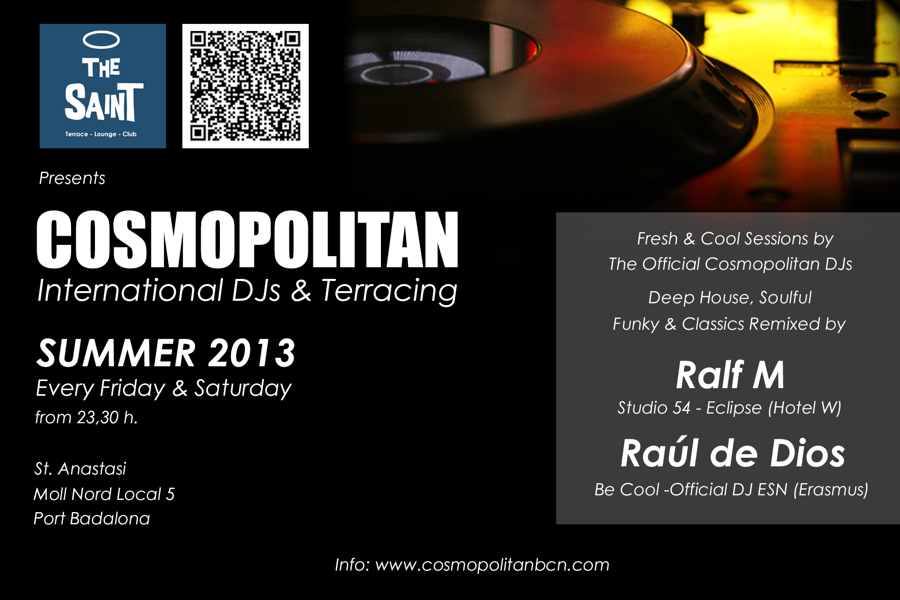 El próximo día 13 de Julio inauguramos la temporada de verano en la terraza «The Saint» en el Puerto de Badalona, uno de los mejores locales del litoral que ha apostado por los sonidos Deep, Soulful, Funky y Classics Remixed a cargo de los DJ residentes de Cosmopolitan: Ralf M y Raúl de Dios.